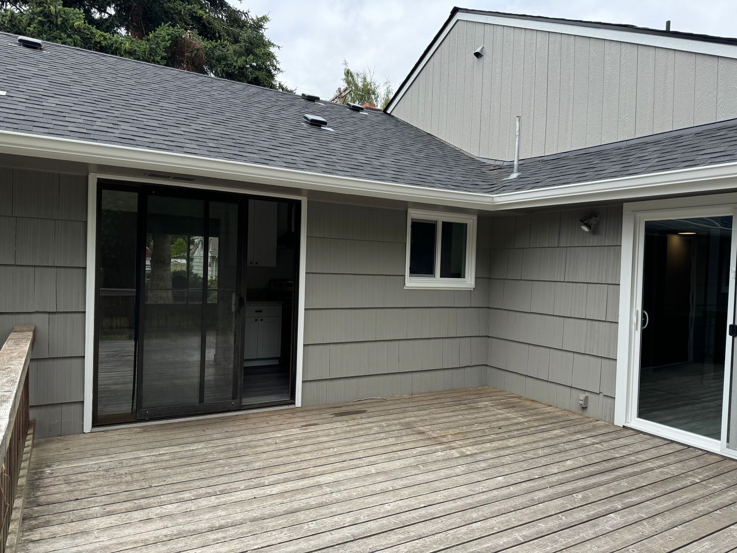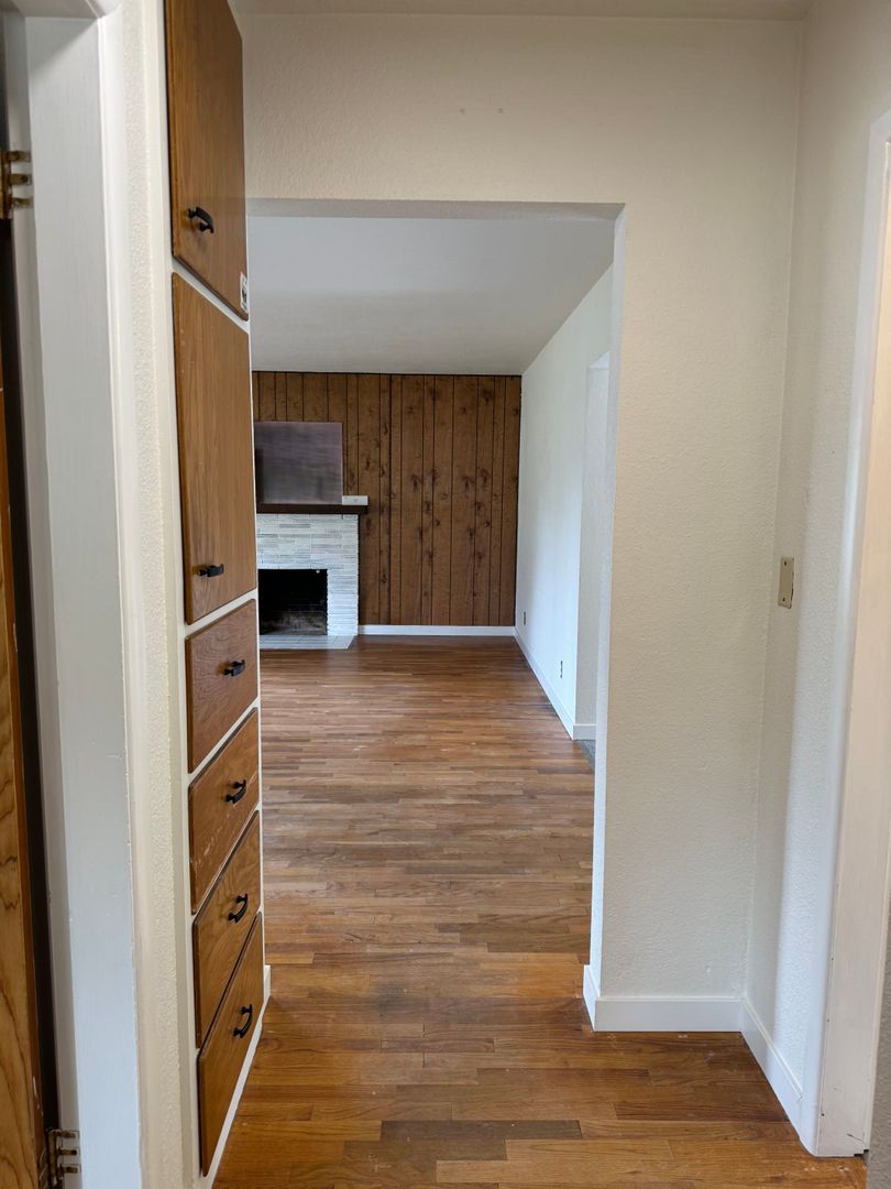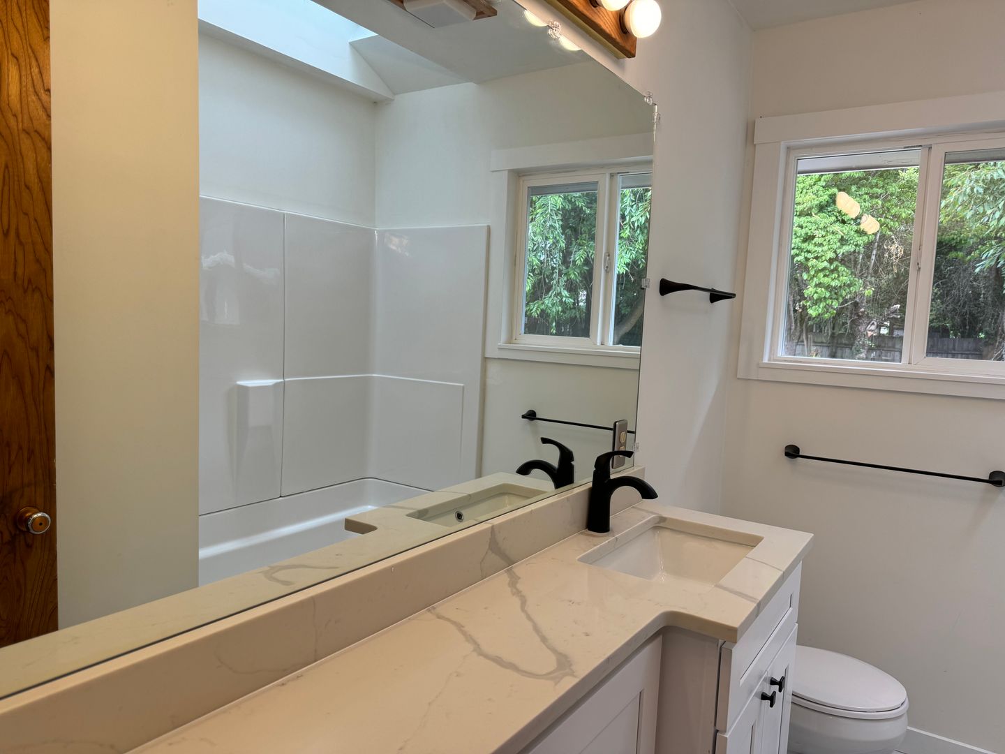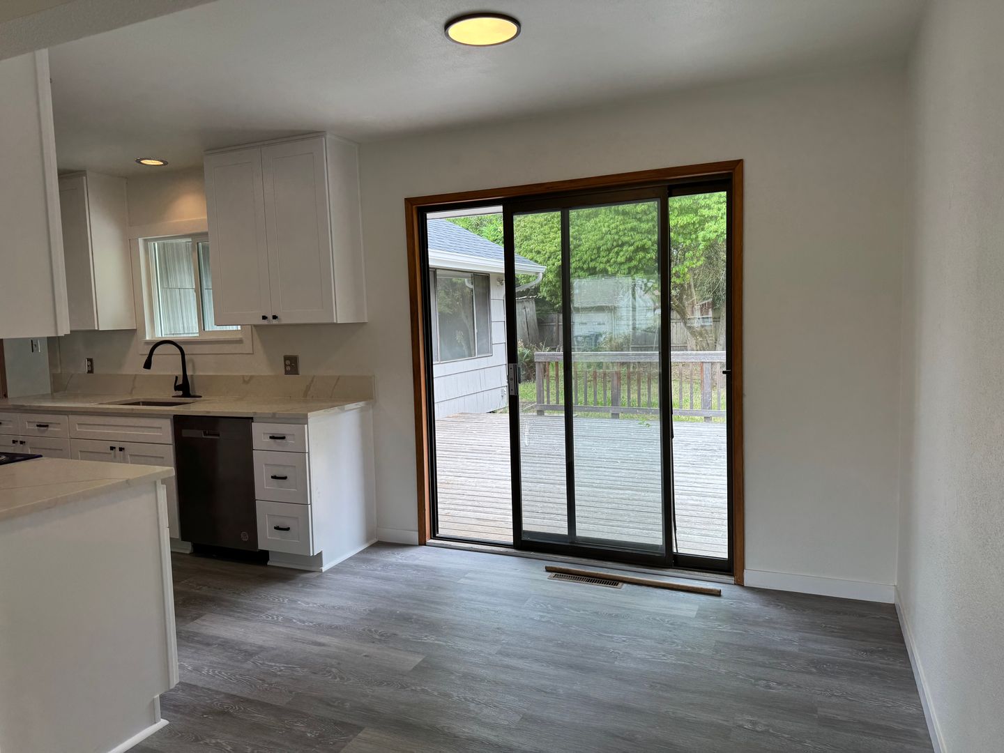 Beautiful 3-bedroom, 1.5-bath house in Eugene, featuring an open kitchen equipped with stunning quartz countertops and stainless-steel dishwasher, stove/range, and refrigerator.