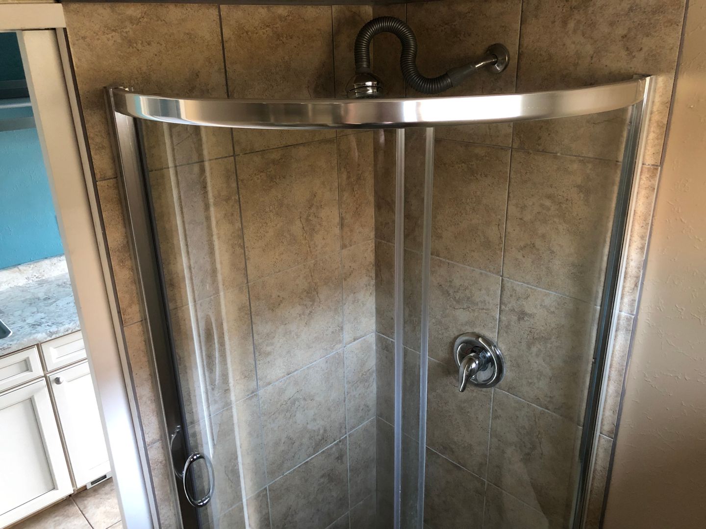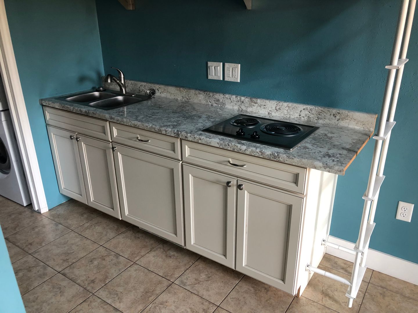 This 1 bedroom 1 bath tiny home has a kitchen with a lot of storage space.