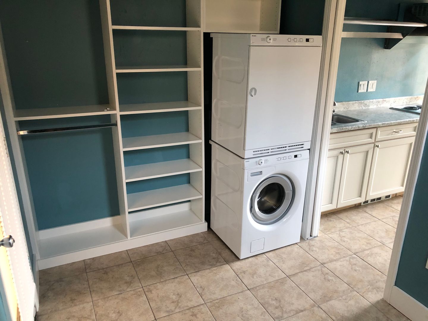 There is a stackable washer and dryer and the bedroom can fit a Queen sized bed in it!