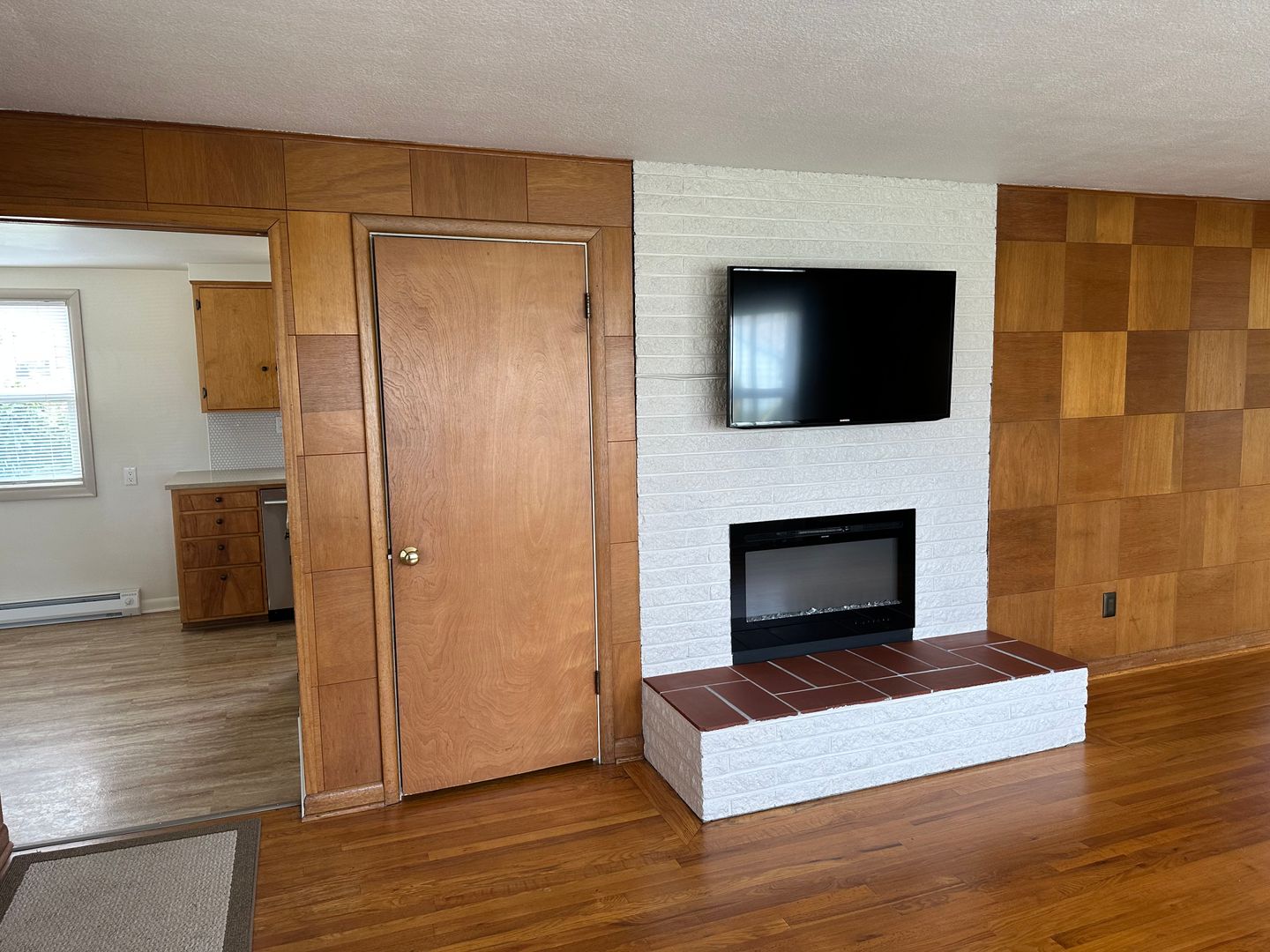The living room has large windows for great natural light and a cozy electric fireplace!