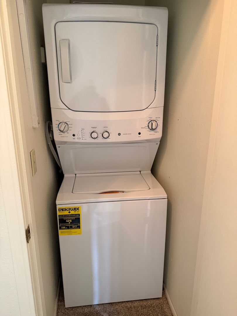 Stack able washer and dryer located conveniently upstairs.