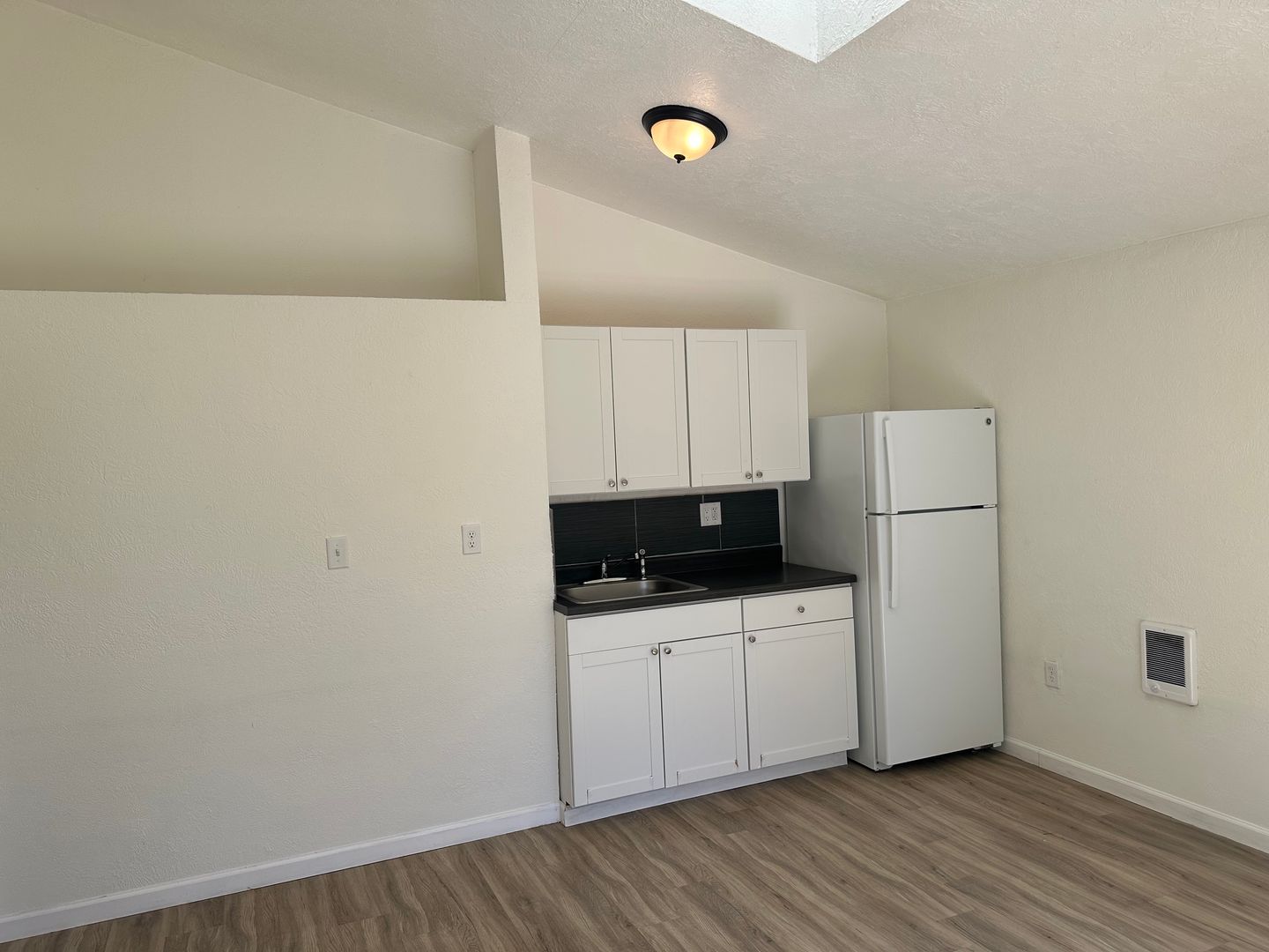 Vaulted ceiling throughout making it feel open and spacious! Kitchenette area with fridge. This unit does not have a stove.