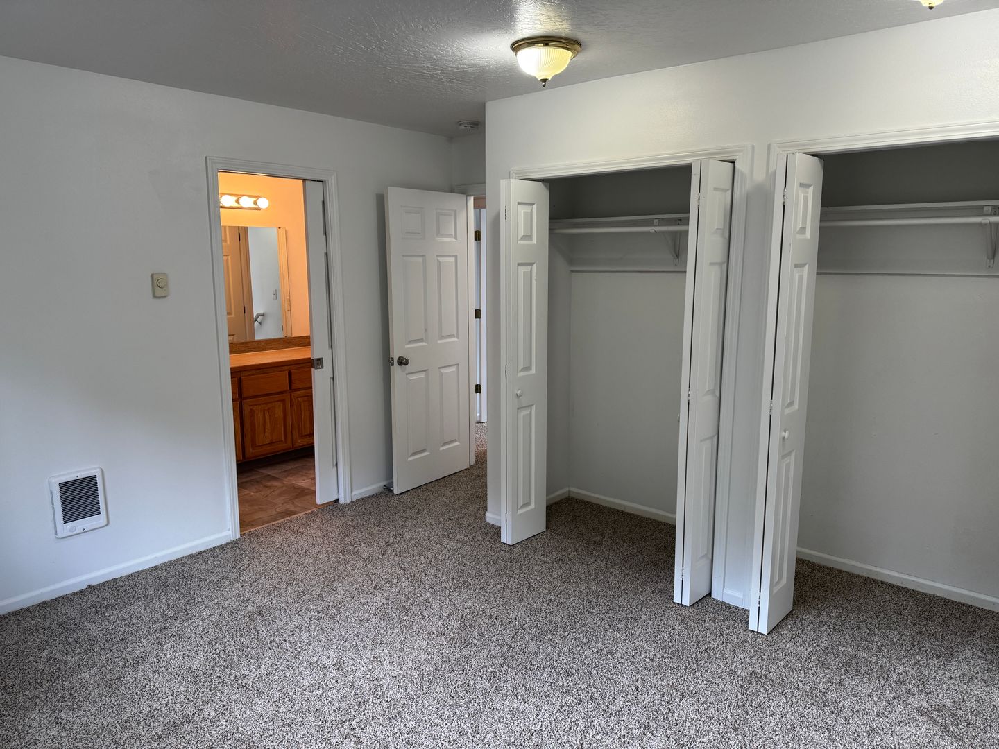 One bedroom with a large closet and an attached full bath downstairs.