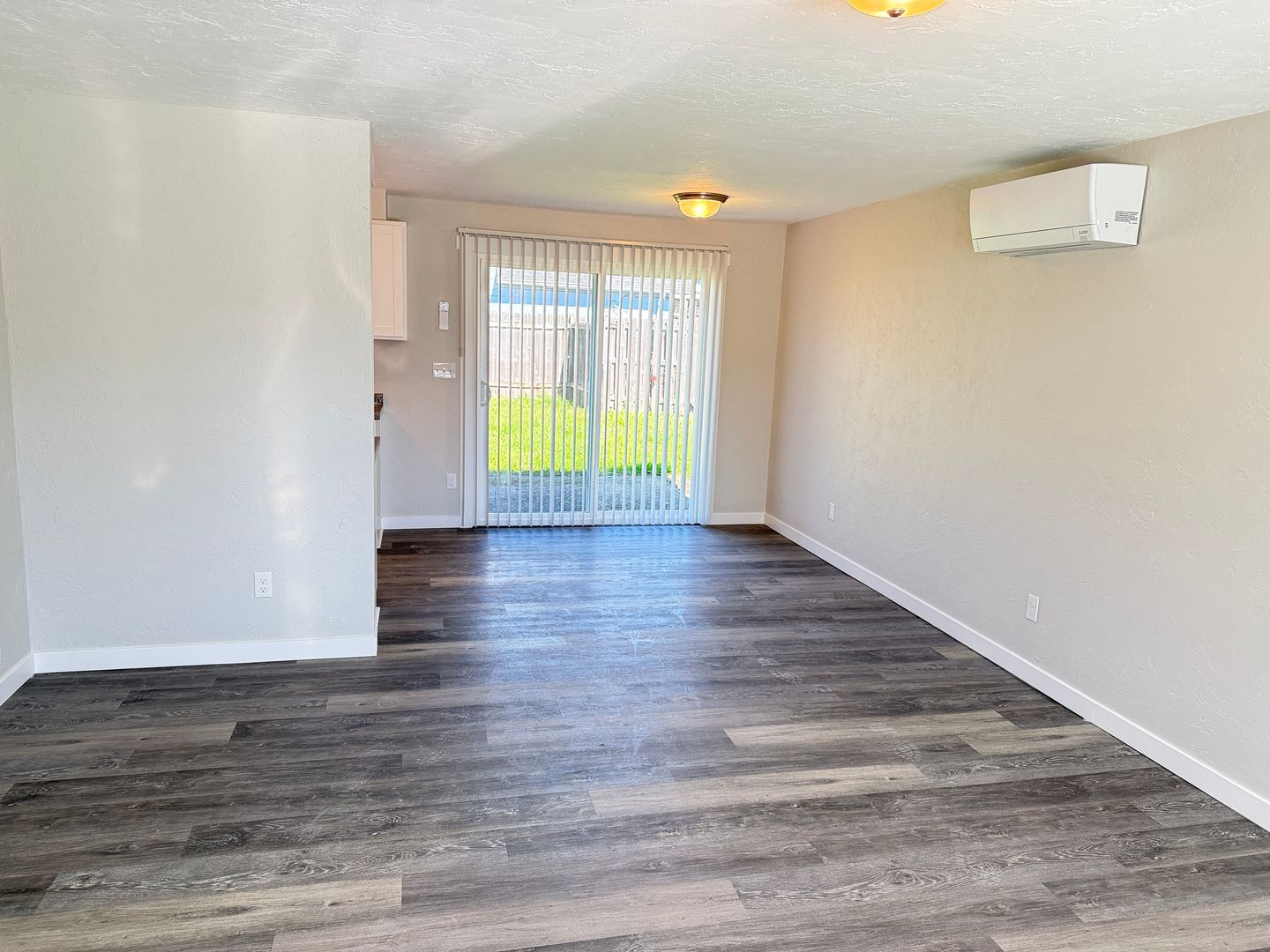 The living room is open to the kitchen, with a sliding door to the back yard. New kitchen cabinets, countertops and appliances.