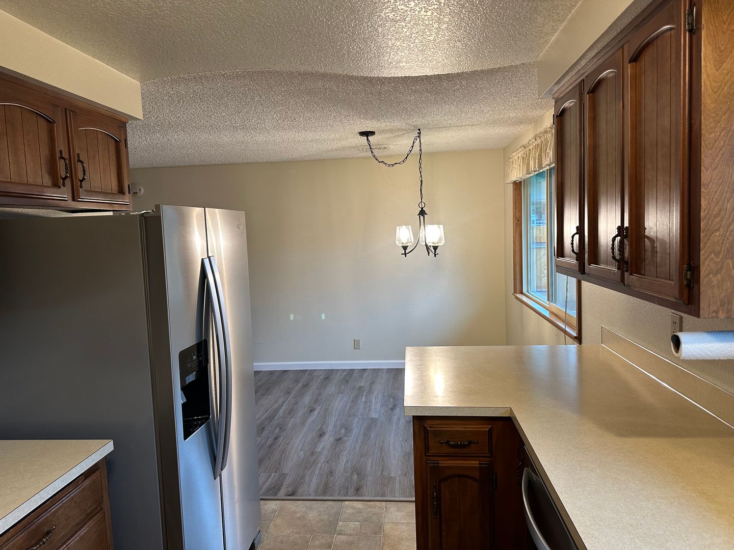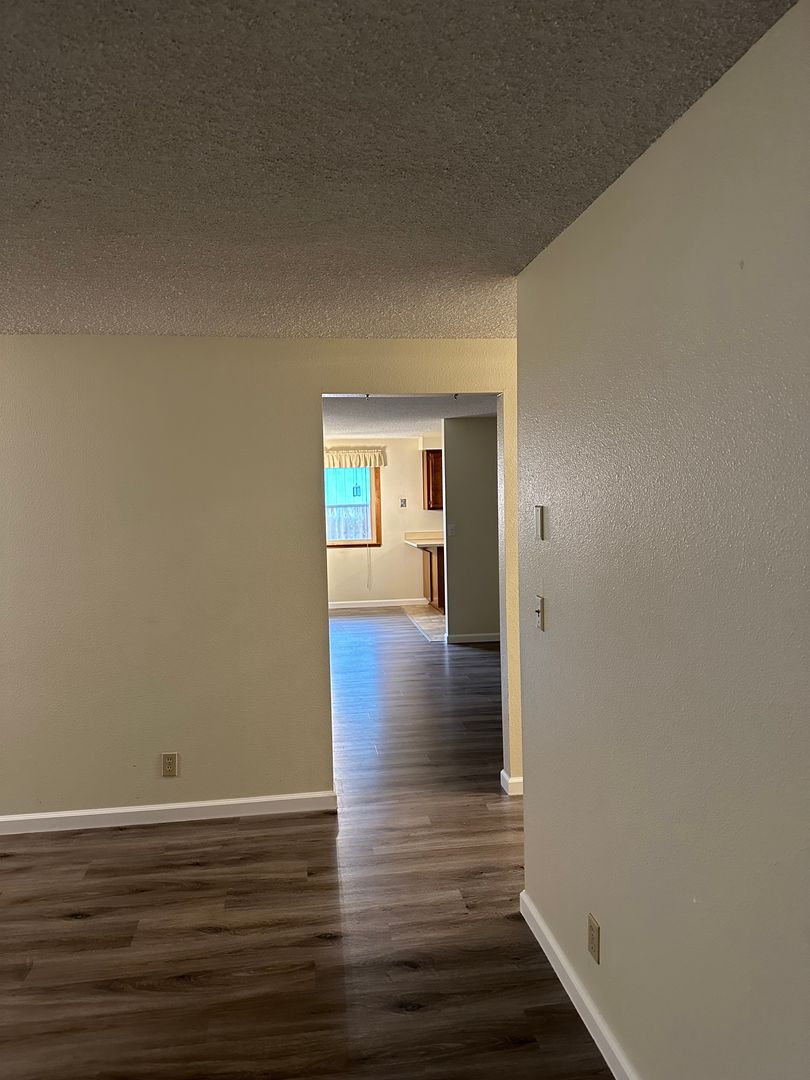 Spacious living area, that flows into the dining room and kitchen. Beautiful new LVP flooring! New light fixtures and fresh paint!