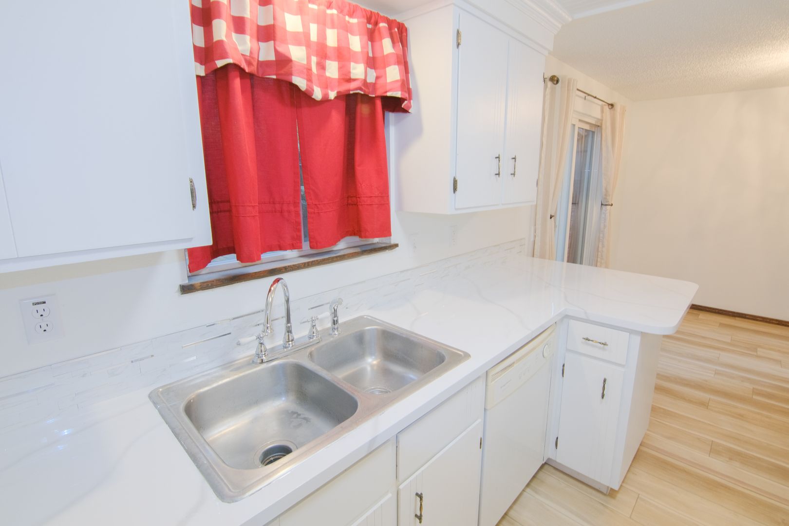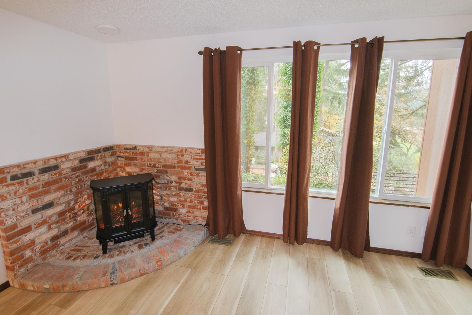 The living room has large windows for great natural light and an electric fireplace! The dining area has a sliding door that leads to the detached deck in the back yard.