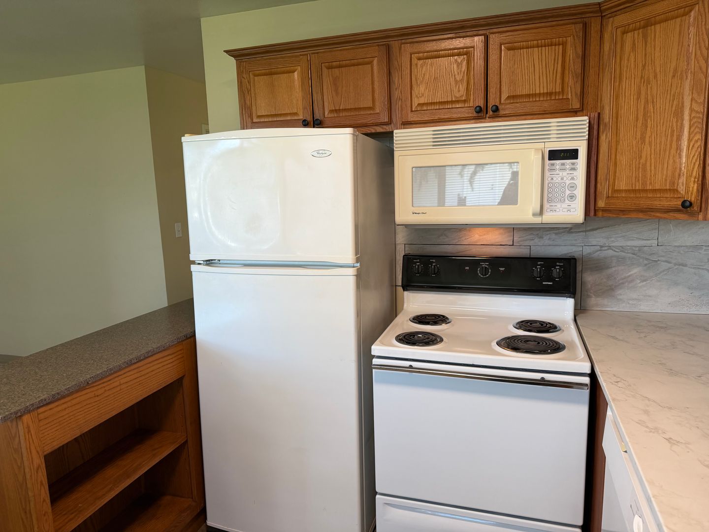 Kitchen has nice cabinets and beautiful tile backsplash!