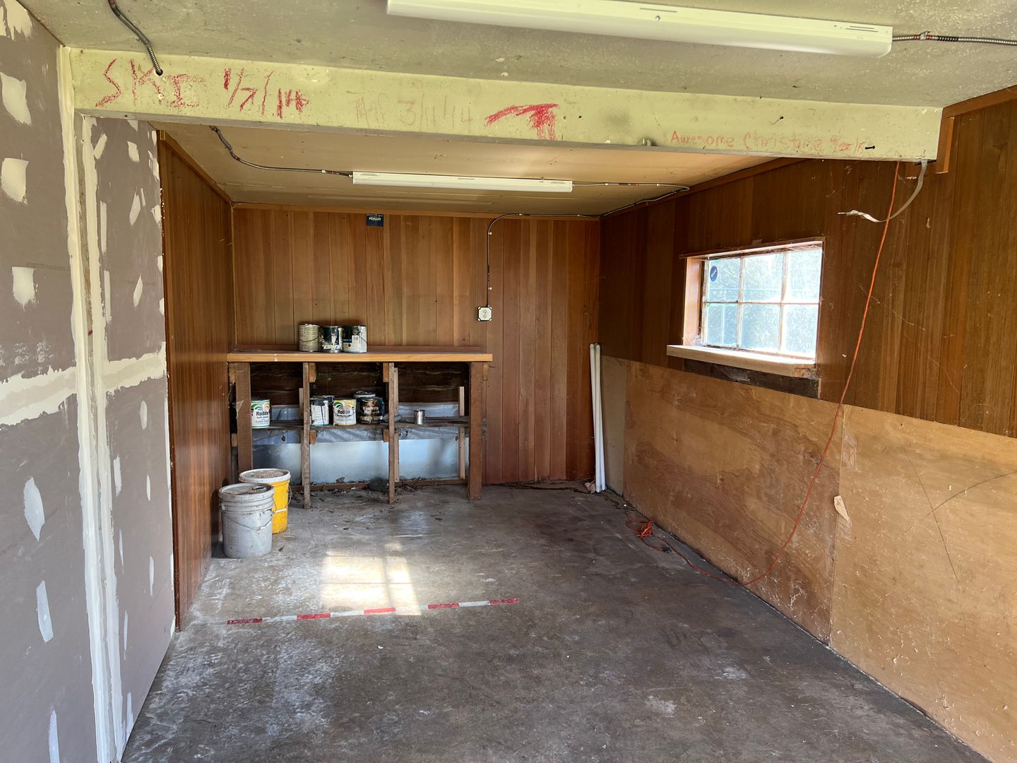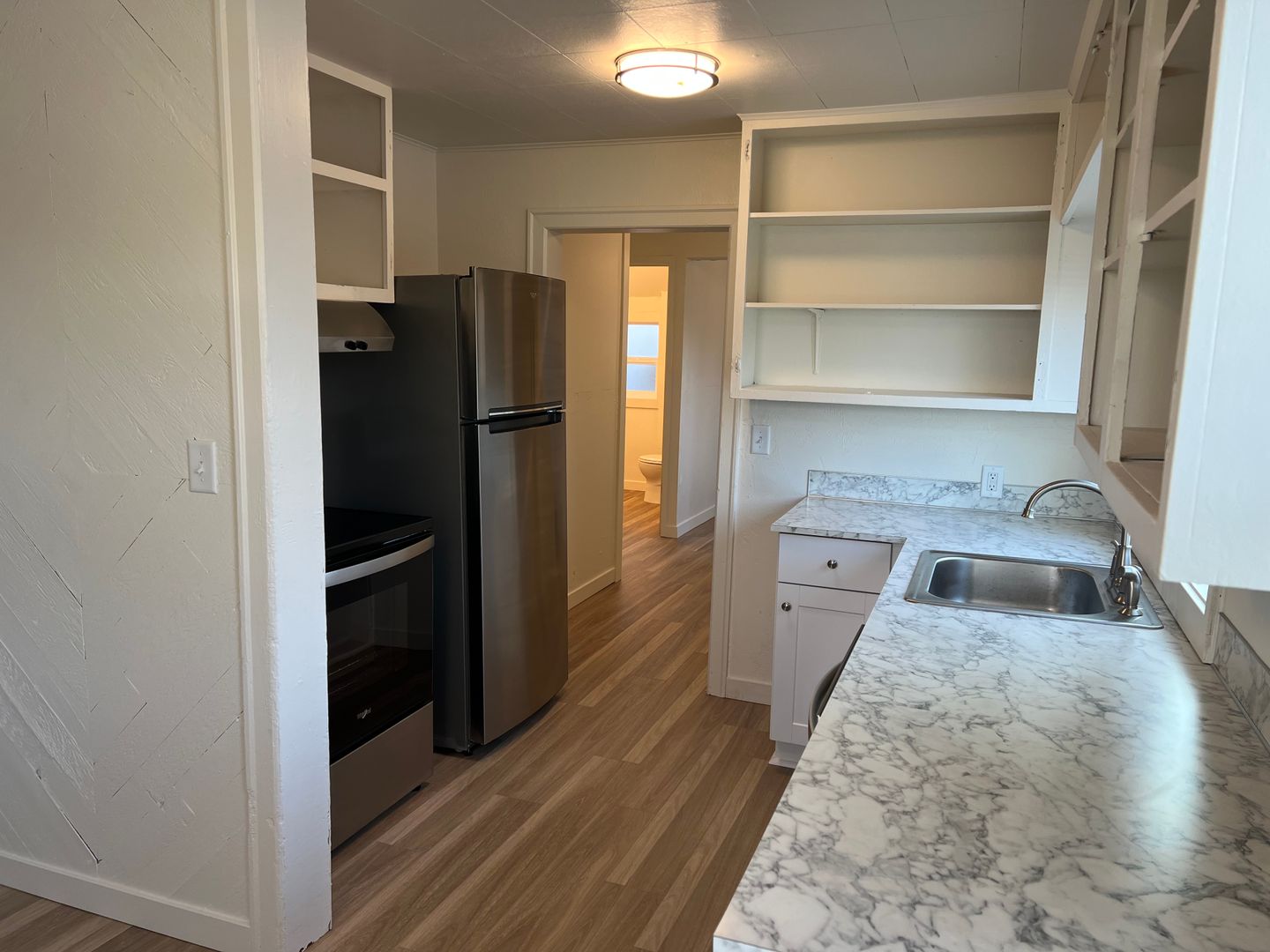 The kitchen has new counters, sink and appliances with trendy open shelving for the upper cabinets!