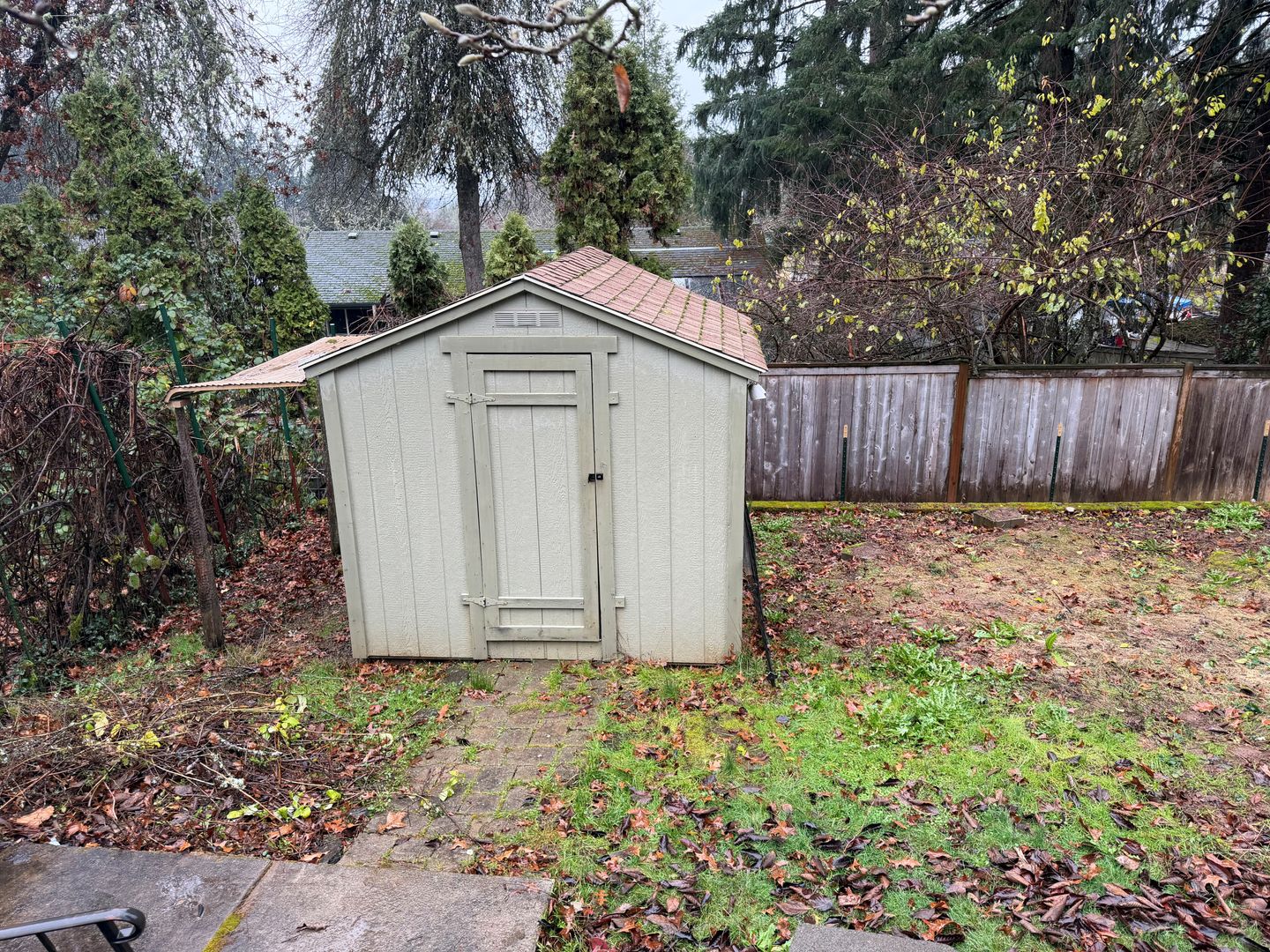 Fenced back yard, raised garden beds, storage shed and an attached 2 car garage with opener.