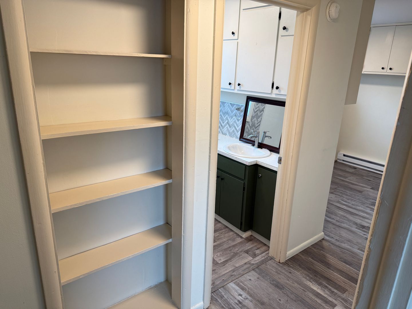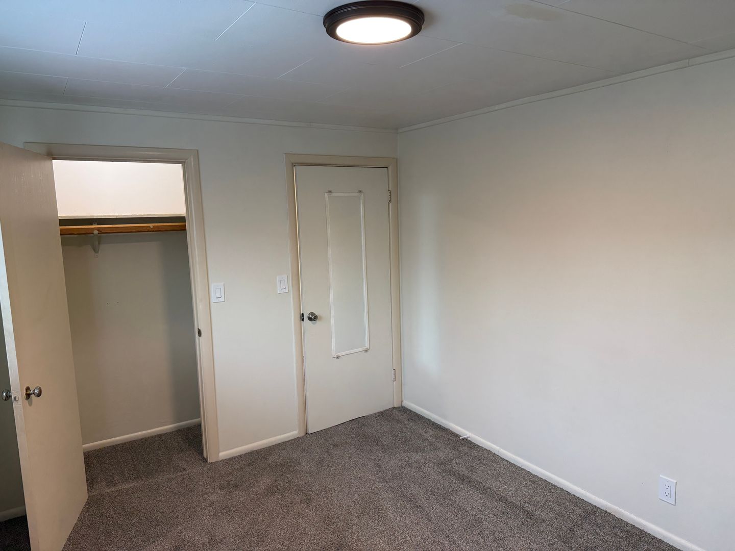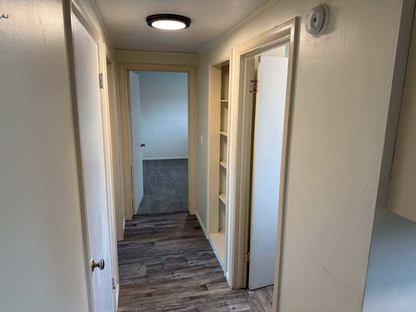 Built in cabinets in the hallway and new carpet in the bedroom!