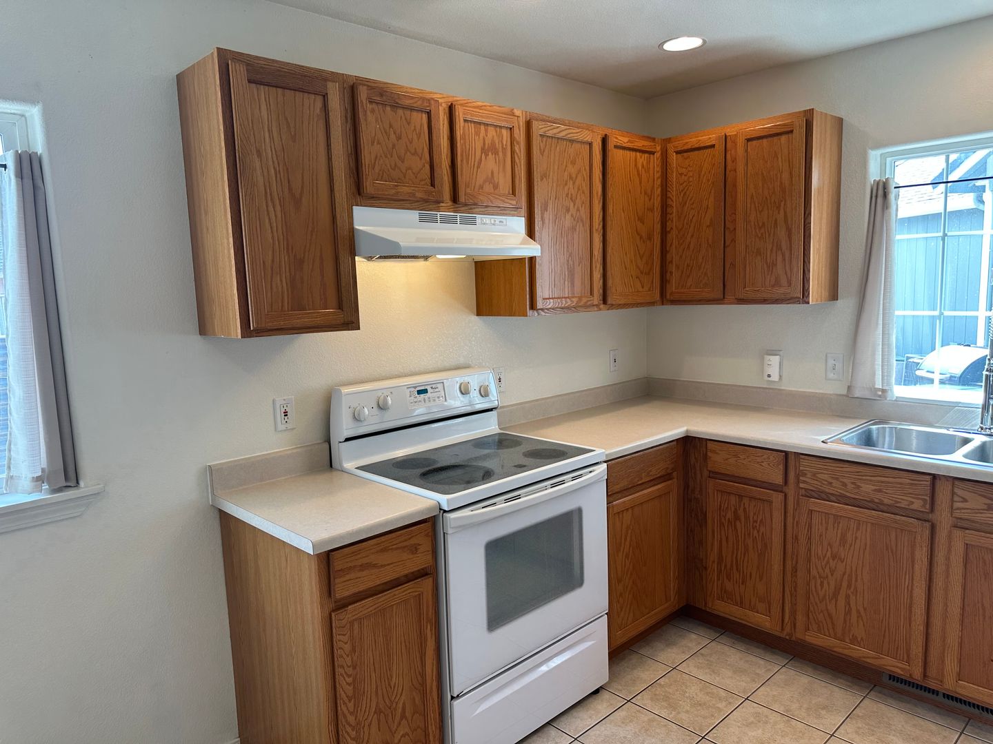 Large kitchen with newer kitchen cabinets, countertops and appliances.