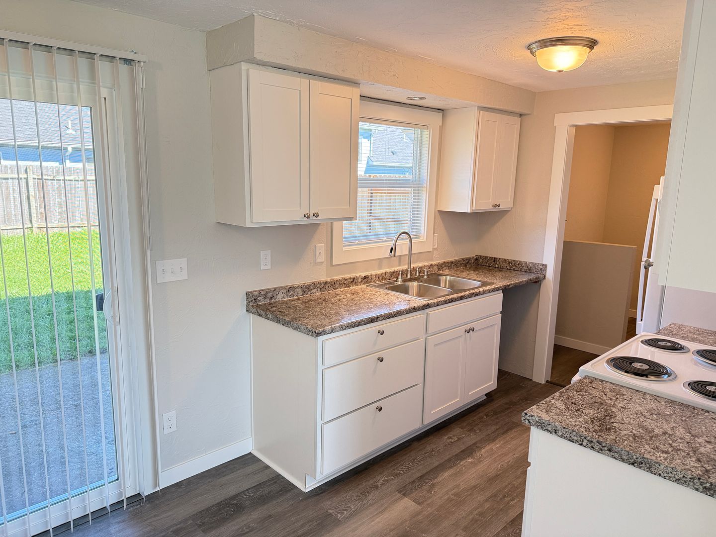 The living room is open to the kitchen, with a sliding door to the back yard. New kitchen cabinets, countertops and appliances.